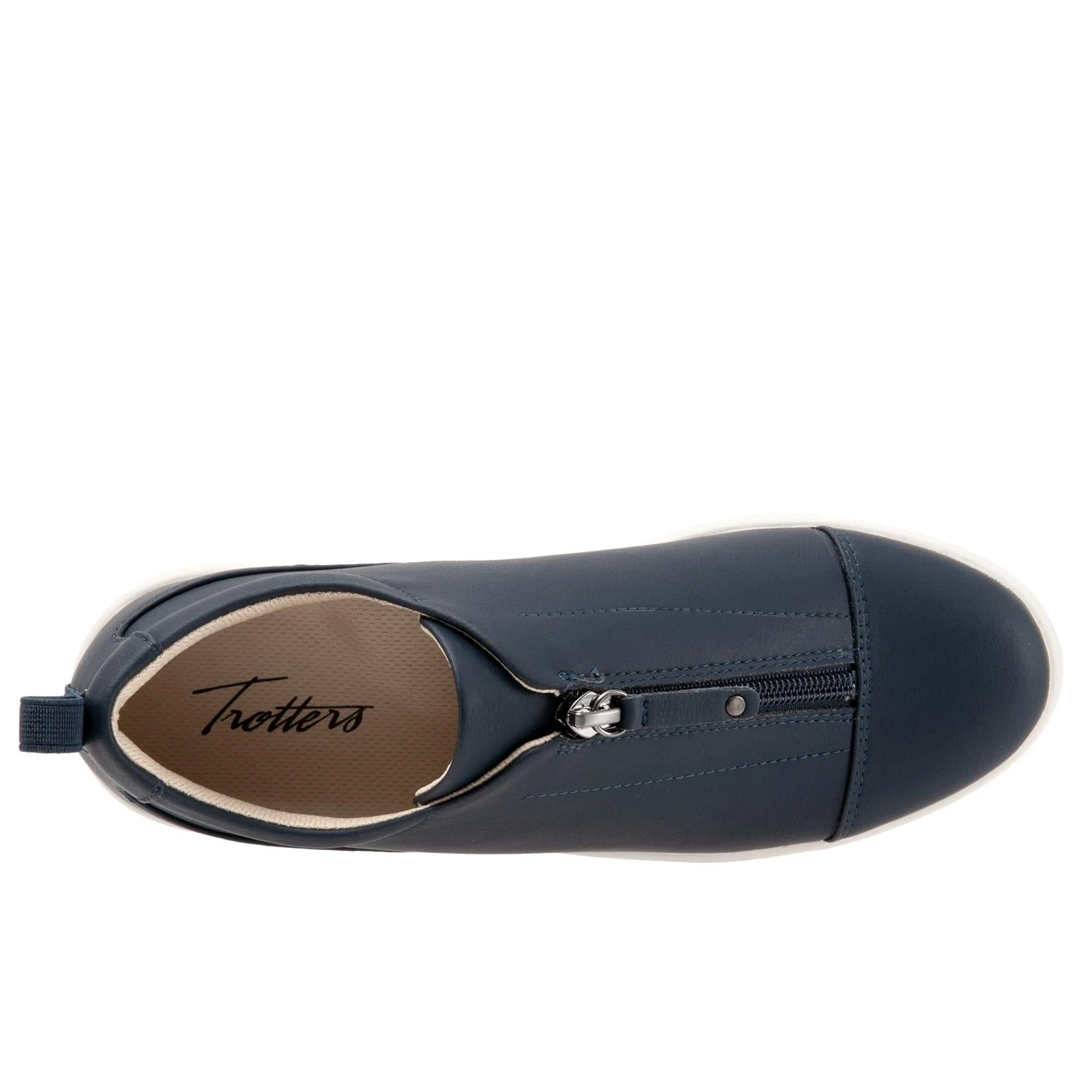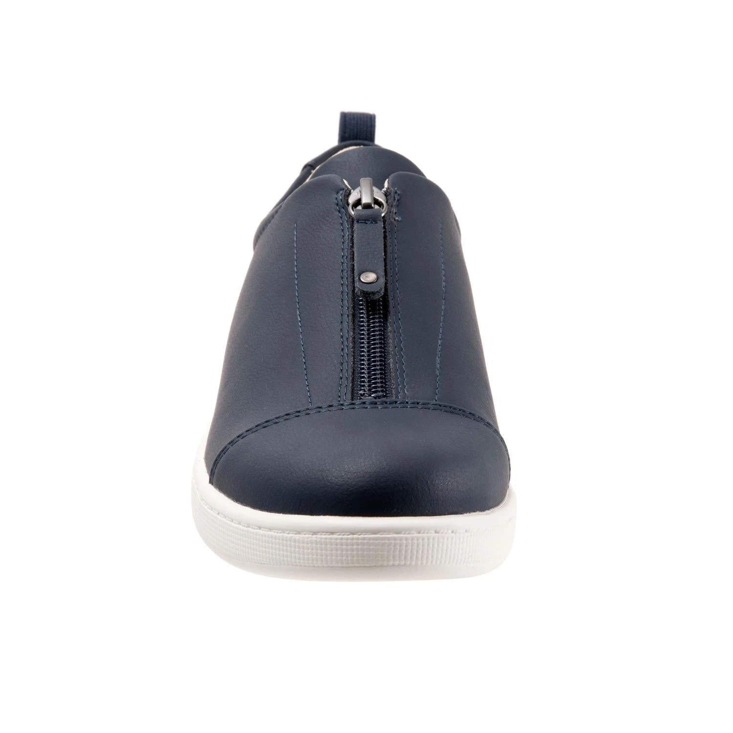“A playful front zip closure adds style and ease to a low-profile sneaker lifted by a white platform sole, matte leathers and eye catching exotics.”