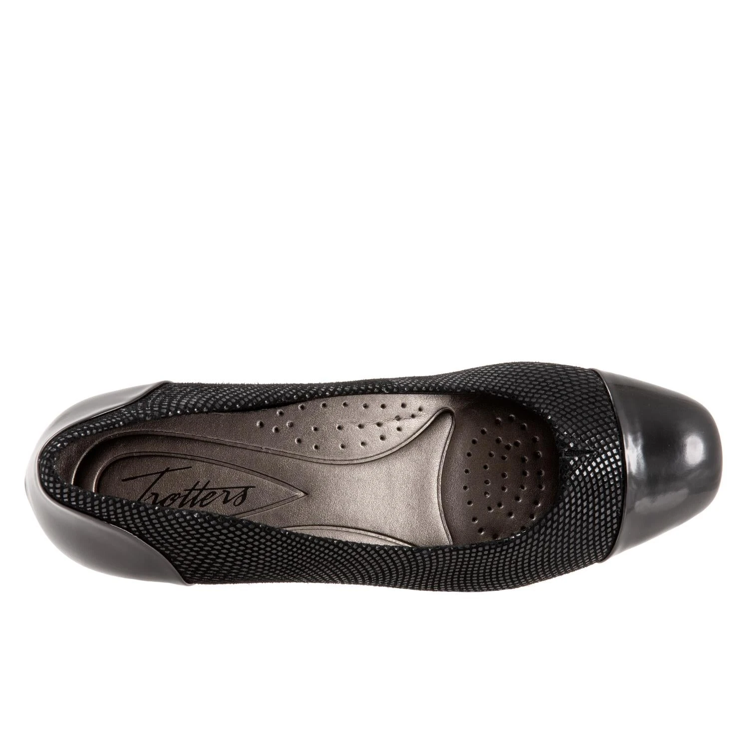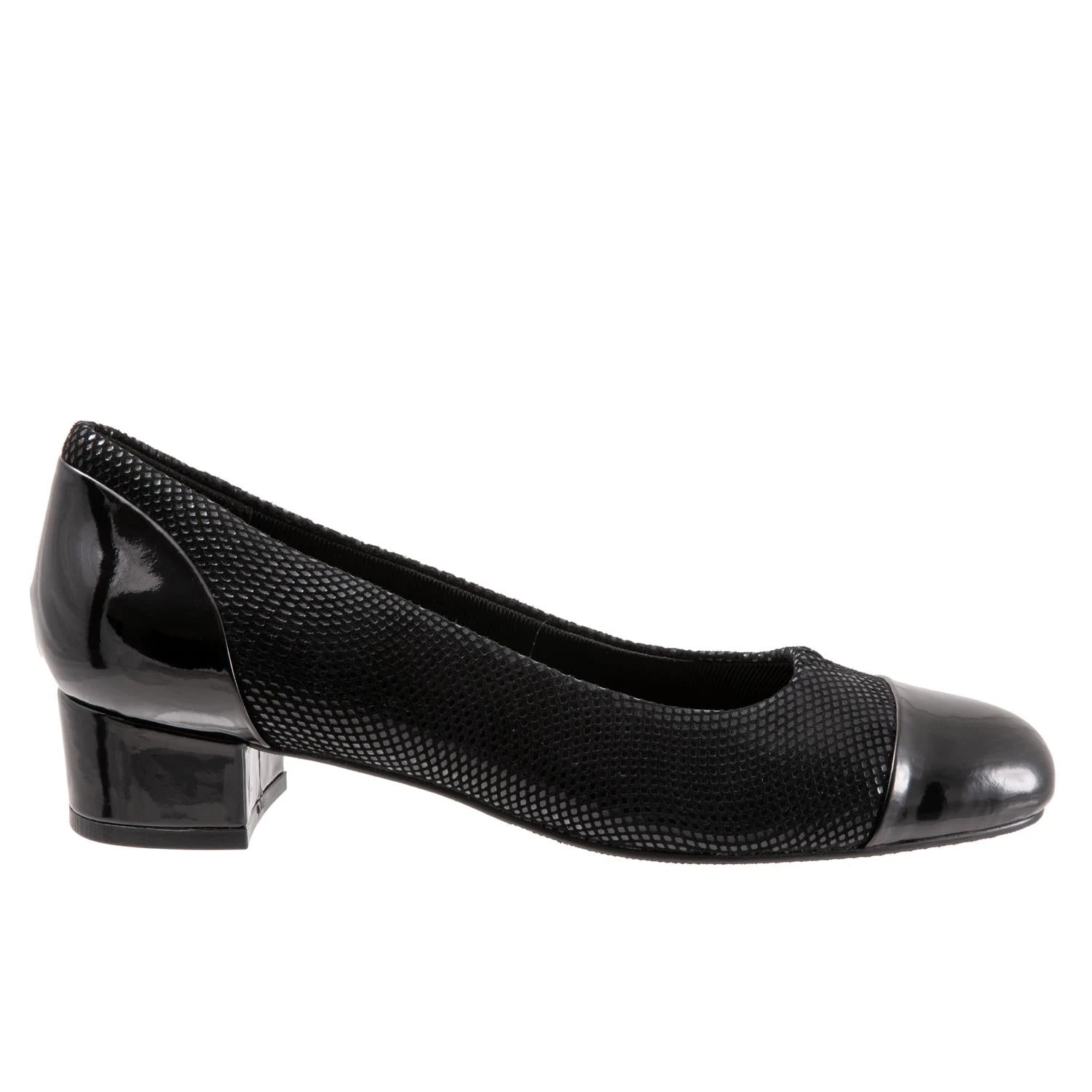 “Rich metallics and illuminated mini dot leathers accented with a glossy patent toe cap adds seasonal flare to the Daisy. Set atop a walkable block heel in a comfort focused square toe, this core silhouette provides all day wearability.”