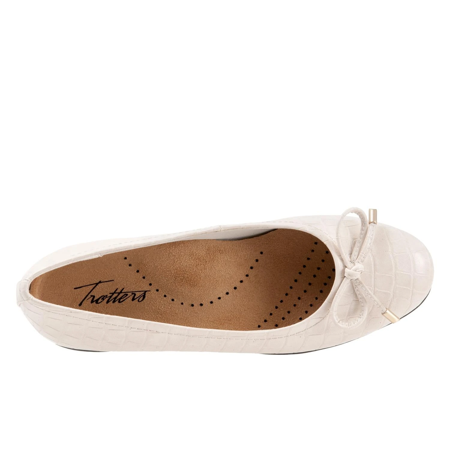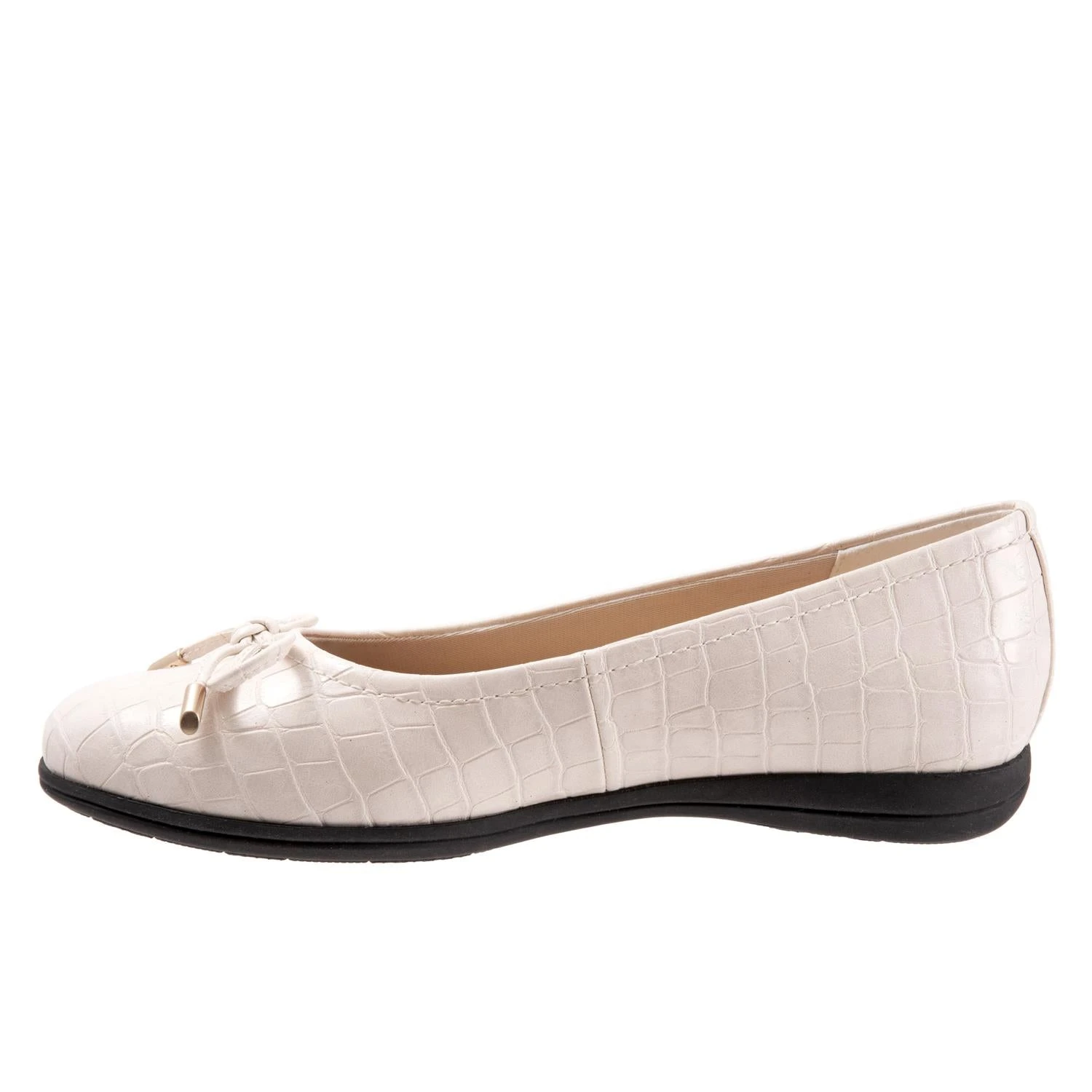 Champagne metallic and semi gloss croco print adds elevated dimension to a charming ballerina flat. Delicate hardware adorns the bow-trimmed toe for trend right style.