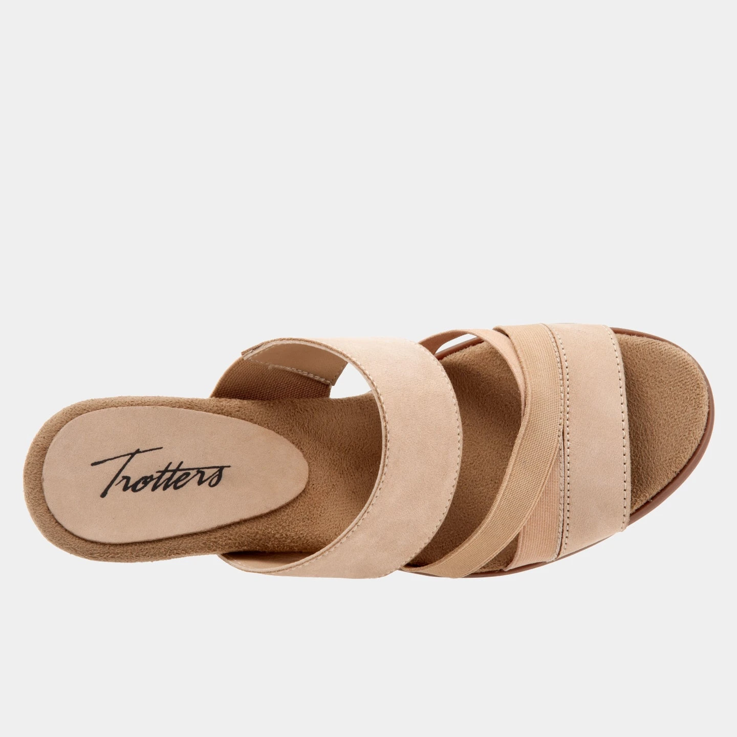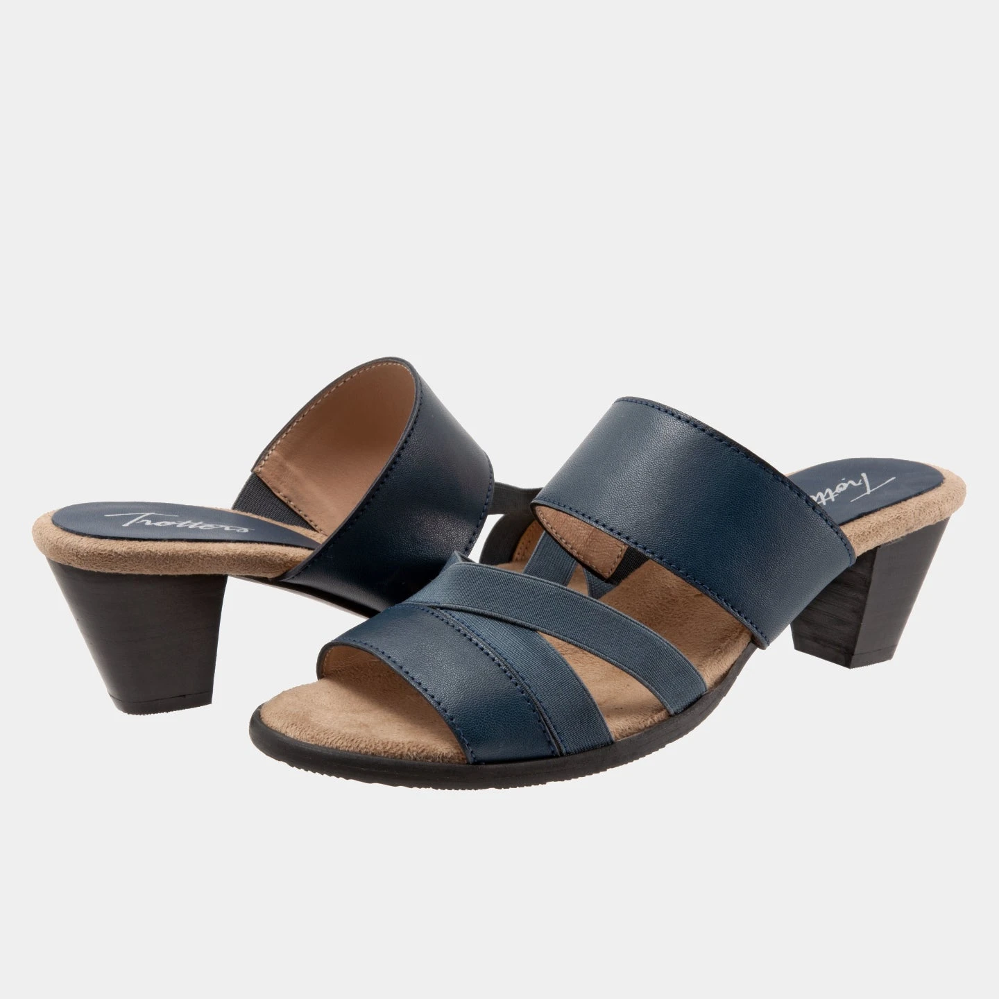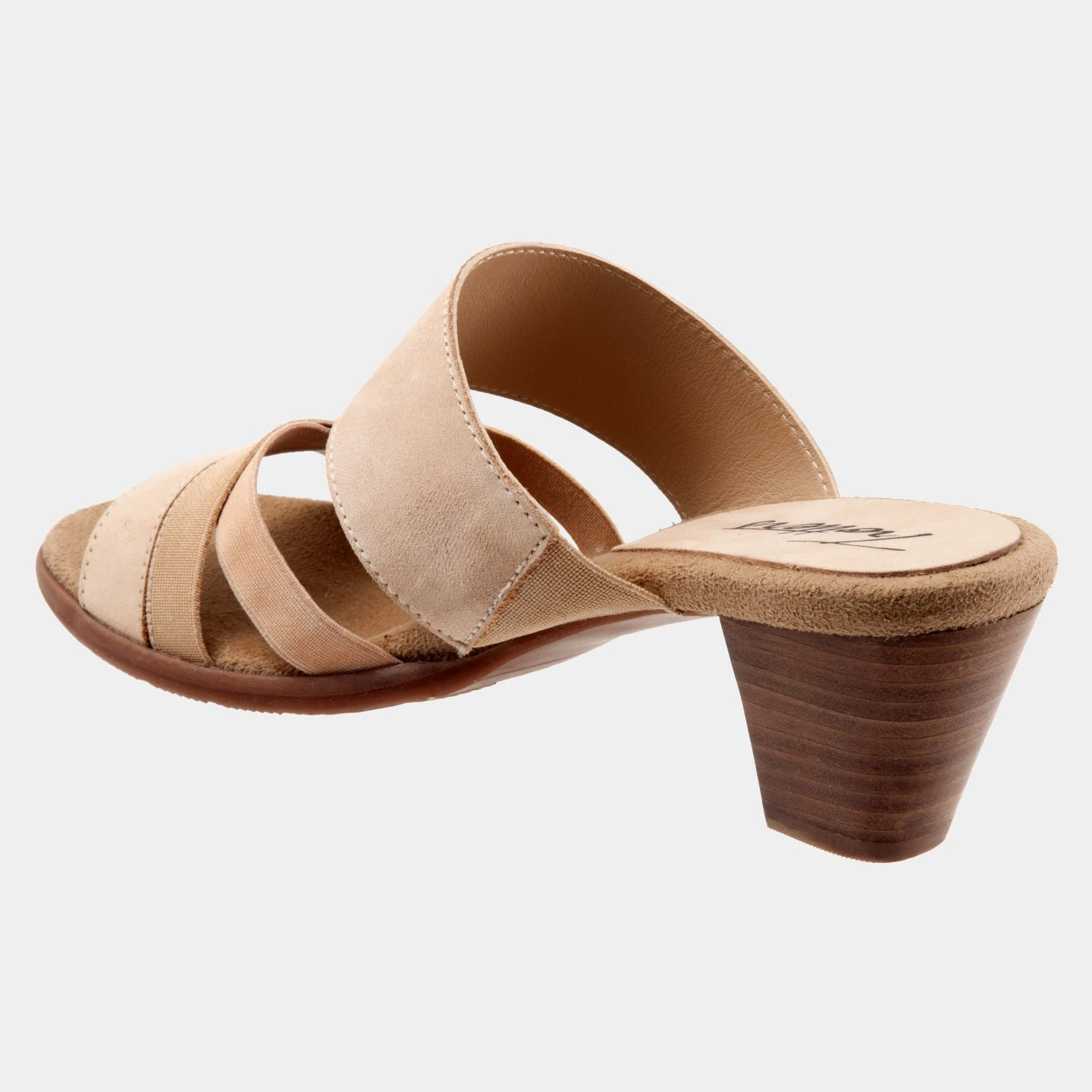 Sleek slide on heel with top straps and a stacked heel for a soft and comfortable fit throughout the day.