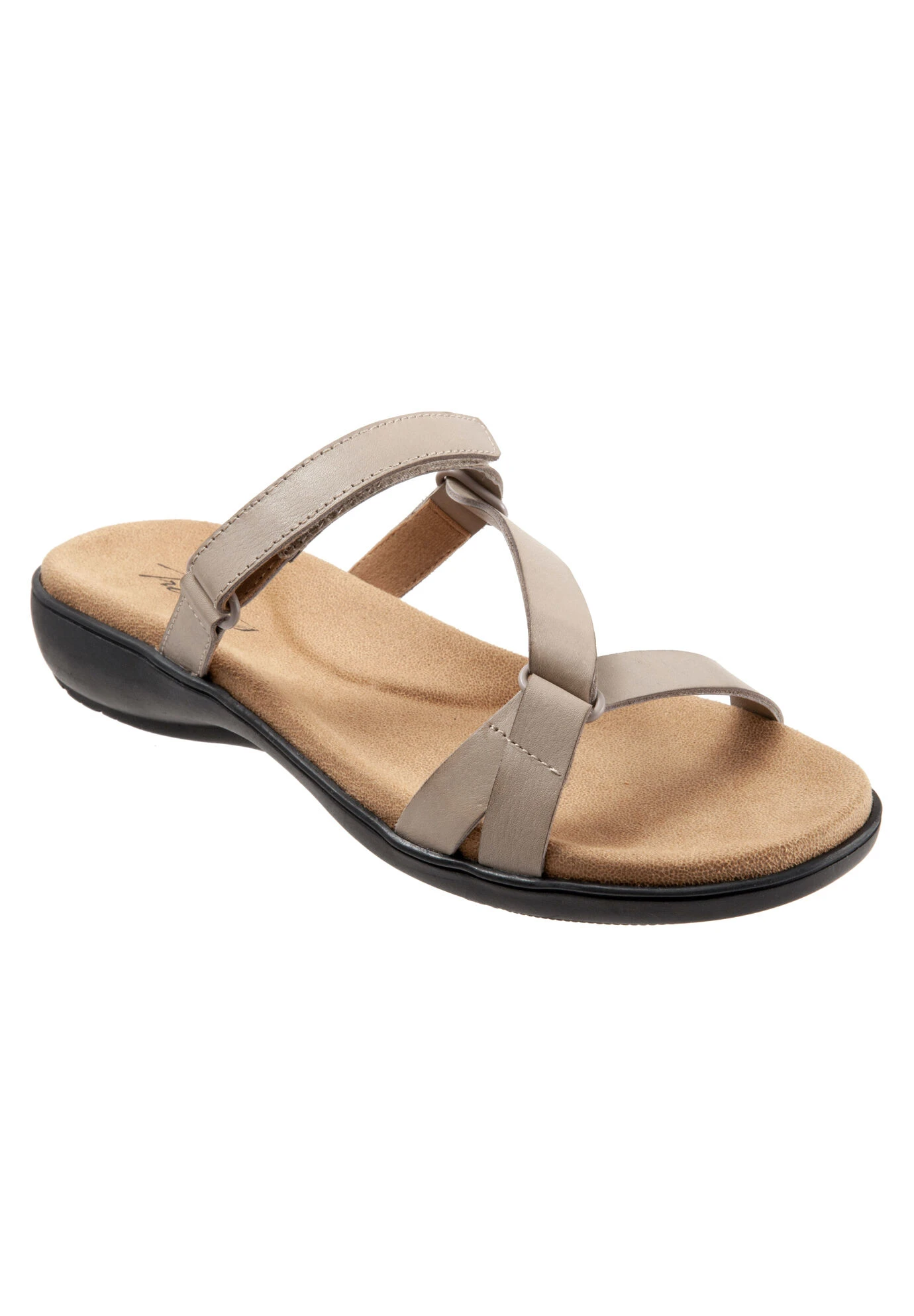 Slim leather straps with asymmetric adjustability gives sporty appeal to this summer casual. Soft premium leathers with raw edge treatments gives modern appeal to her new summer go to.